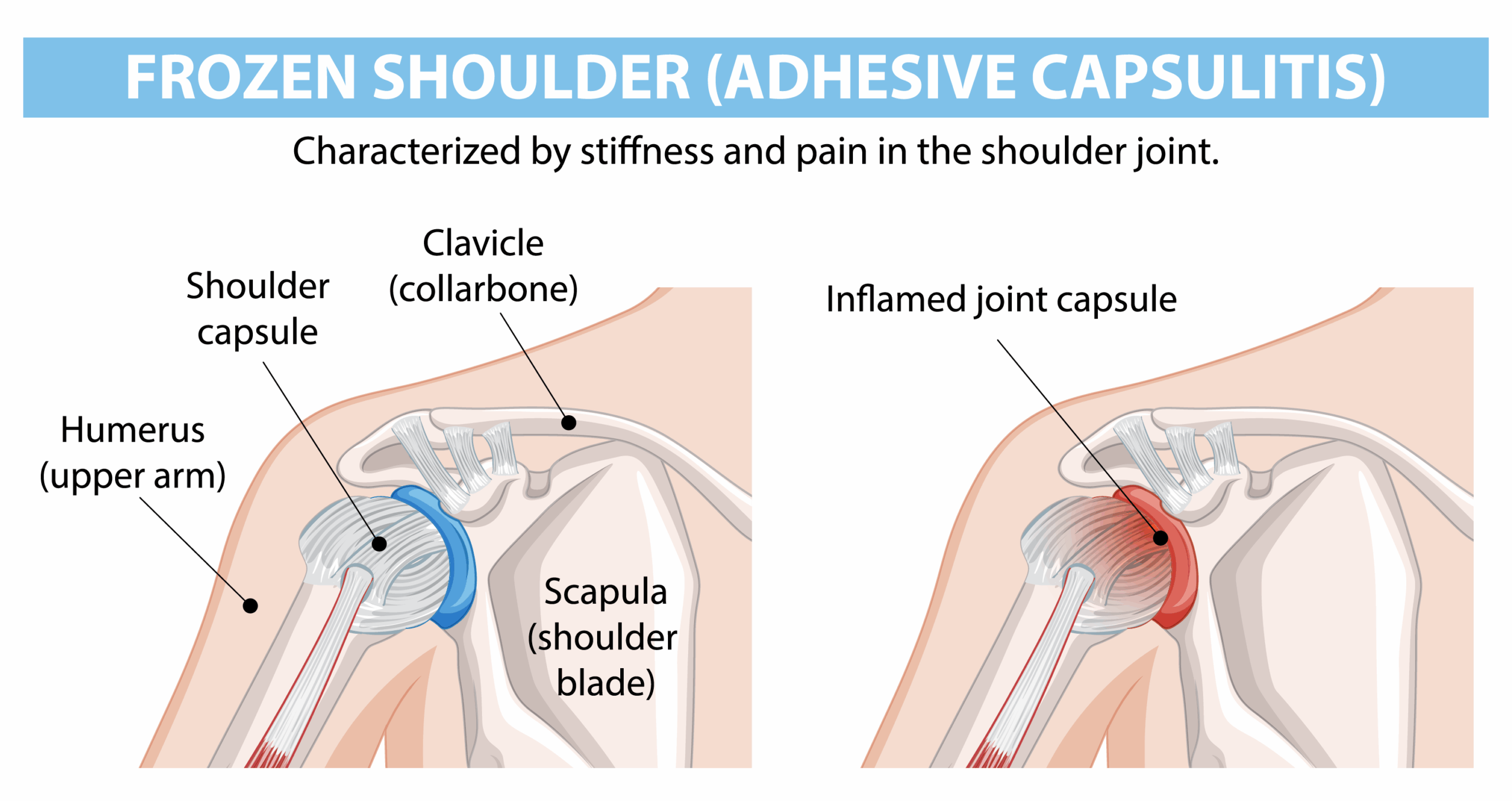 Frozen shoulder, medically known as adhesive capsulitis, is a condition involving inflammation, thickening and contracture of the shoulder capsule, leading to progressive stiffness and pain.